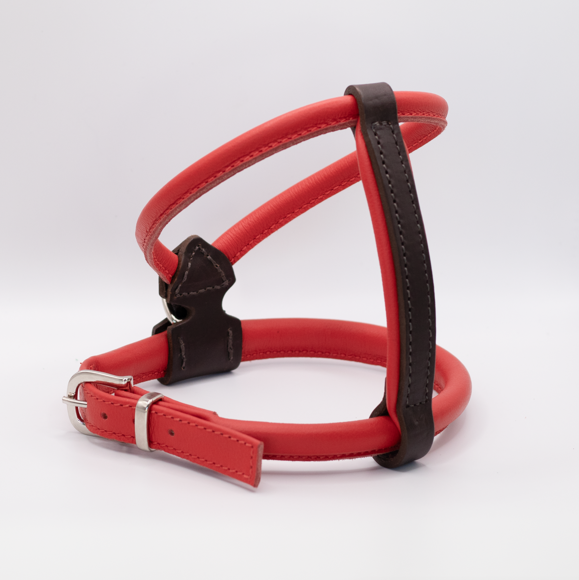 Please note - the main body of the harness will feature the soft leather in the predominant colour of your choice. At the 'joint' (where the straps intersect and the fastener is located), and on the chest strap that runs from below the neck to the undercarriage (at the front of the dog), we use a 'heavier' (thicker/stiffer) leather. This is a complementary colour. For example, the red is paired with our dark brown. The grey is paired with charcoal.